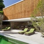 arcando presença ilustre na Praia da Feiticeira, numa das grandes obras do Arquiteto Marcio Kogan, o bambu foi transformado em réguas aparelhadas para revestir toda a fachada do segundo pavimento dessa casa de tirar o fôlego.