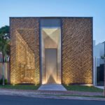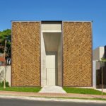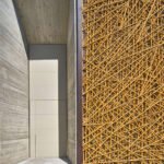 Esses majestosos painéis foram feitos com treliças metálicas revestidas com varas de bambu embaralhado – super resistentes, leves e duráveis. E eles não só chamaram a atenção do olhar por sua naturalidade e criatividade como também fizeram o papel funcional, ou seja, um dos painéis fica fixo para compor a fachada do espaço, enquanto o outro movimenta-se por meio de trilhos para exibir a vitrine quando a loja está aberta e também para protegê-la quando o estabelecimento está fechado.